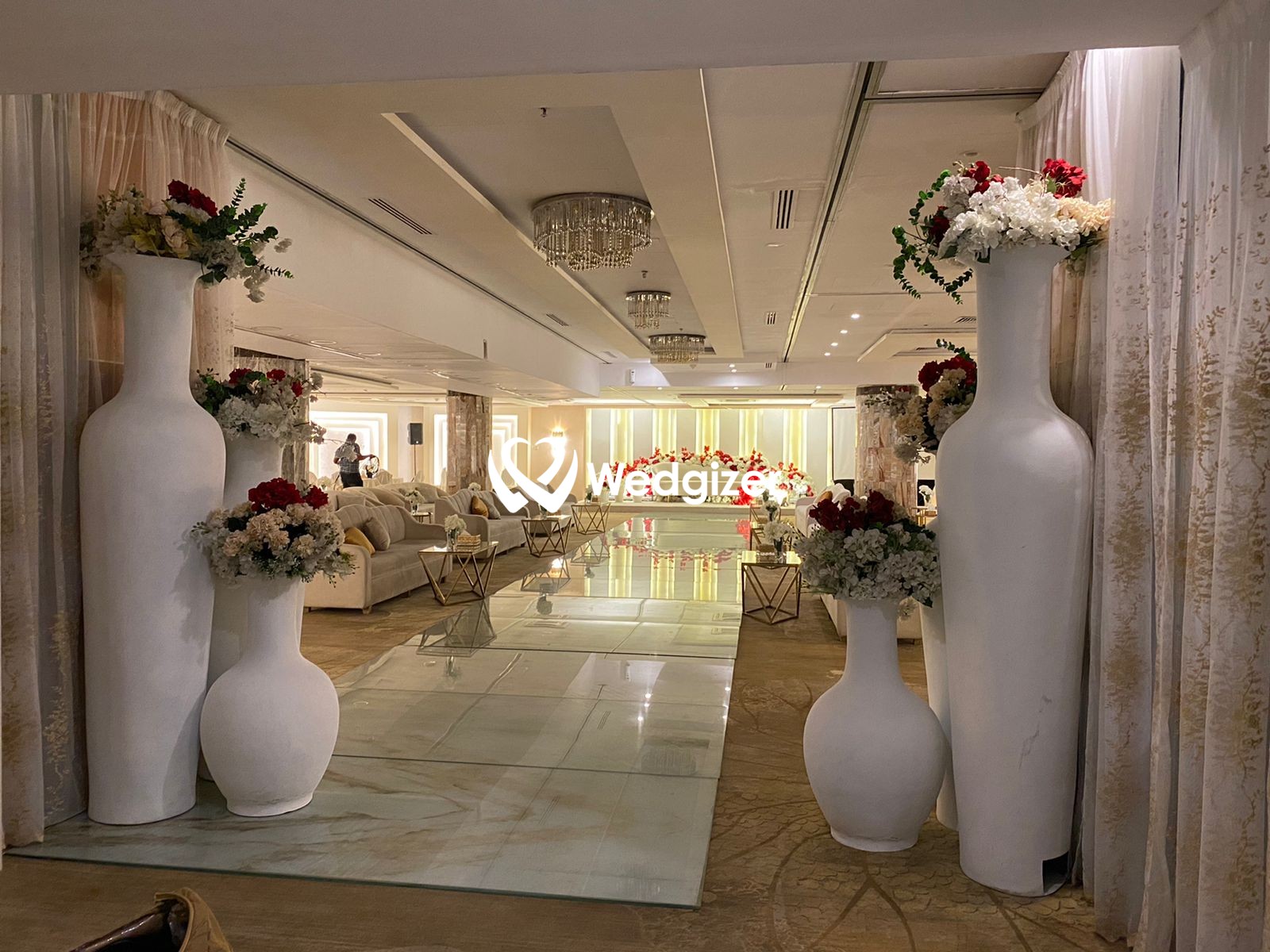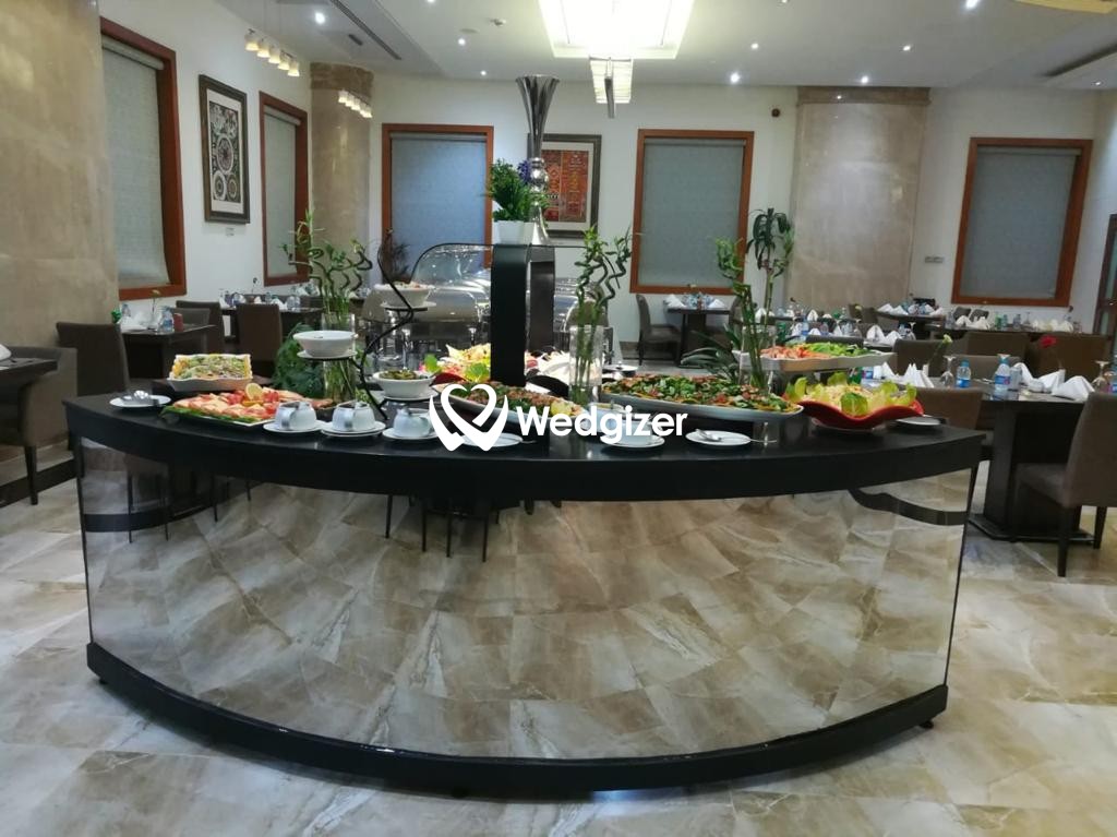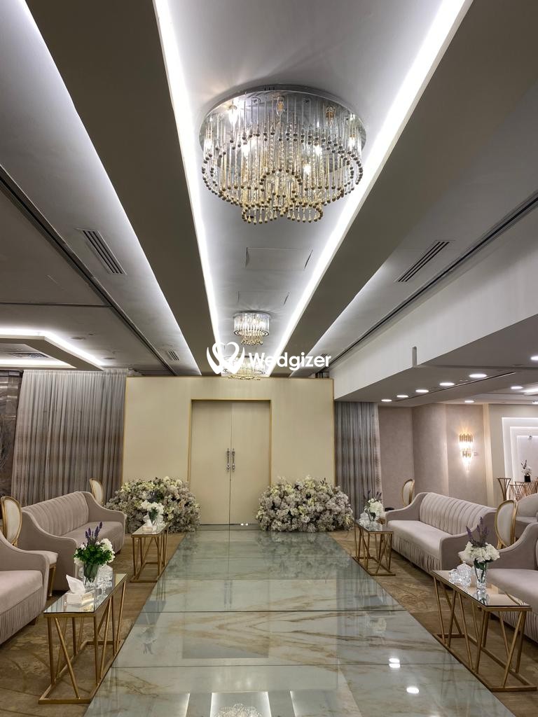 تتمتع قاعة الفندق بديكورات أنيقة وطابع عصري فخم، وتغلب عليها الألوان الفاتحة خصوصاً الأبيض وتدرجات البيج بالإضافة إلى اللون الذهبي المستخدم في العديد من التفاصيل. تزيد تصاميم الأسقف والأعمدة والأرضيات الرخامية والثريات الفخمة من رونق القاعة المزودة بأفخم أنواع الكنب والكراسي والأقمشة الفاخرة بثلاث ألوان (فضي – ذهبي – اف وايت)، بالإضافة إلى الورد الطبيعي الساحر.